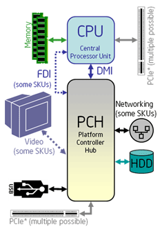 Significa "Platform Controller Hub", tiene muchas funciones que anteriormente estaban distribuidas entre el puente sur y otros controladores, gestionando la comunicación entre el procesador y los dispositivos de entrada/salida, así como funciones de almacenamiento y conectividad.